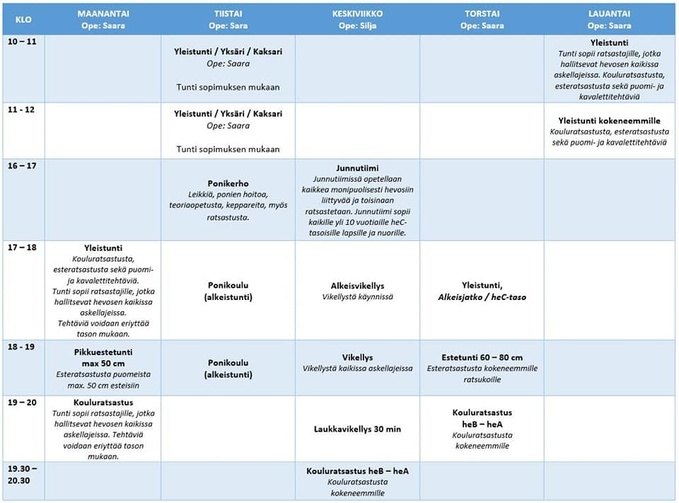 Ratsastuksen opettajana toimii jatkossakin pääosin Helena Lehti. Fay, Martta, Prinsessa ja Rubert jatkavat ratsastuskoulun käytössä. Yksityishevosia voi mahdollisuuksien mukaan vuokrata omistajilta koulun tunneille. Tunteja on tarkoitus pitää 4 päivänä viikossa.