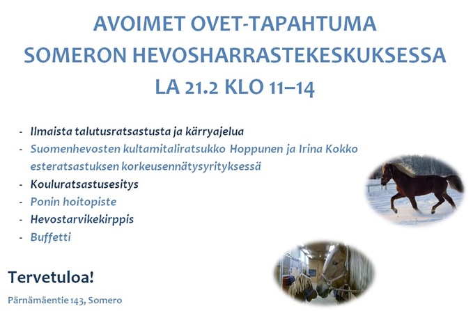 Someron Hevosharrastekeskus (Pärnämäentie 143) järjestää Ponikerhon tiistaisin klo 17-18 alkaen 7.2. Kerhossa opetellaan ponien hoitoa ja käsittelyä, ratsastustakin kokeillaan. Lisäksi leikitään, tehdään tehtäviä ja puuhaillaan keppareiden kanssa, oman kepparin voi ottaa mukaan. Kerho sopii 6-12 vuotiaille, hinta 5e/krt tai 40e/10krt. Tervetuloa, ilmoittautumiset paikan päällä kerhossa.