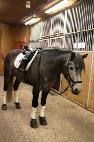 Hehku valmiina suomenhevosten kouluratsastusesitykseen